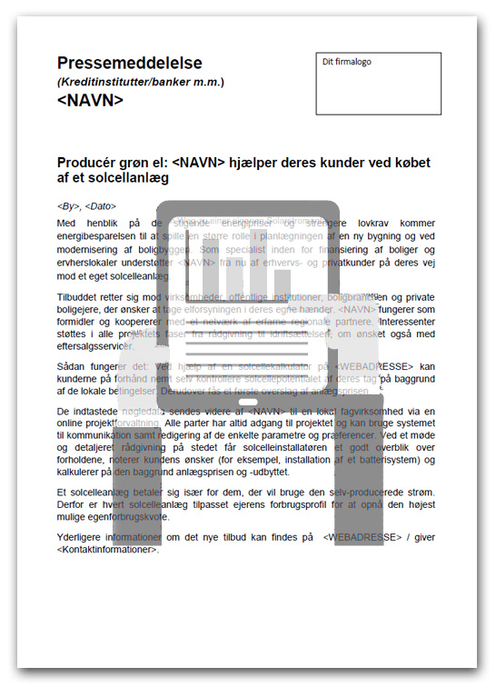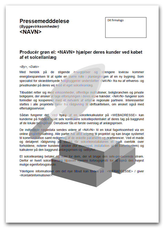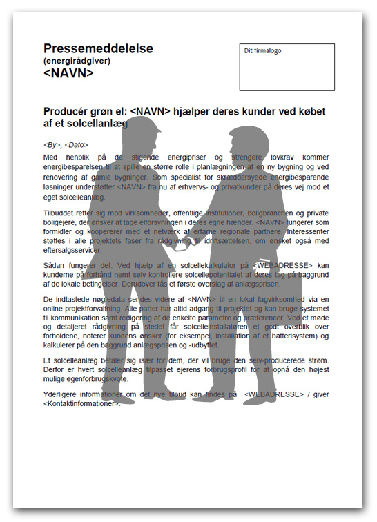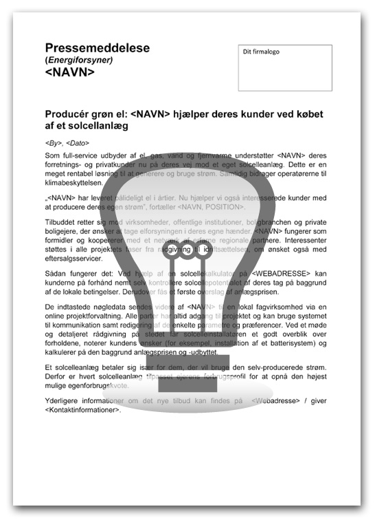 Med vores skabeloner af pressemeddelelser, der er skræddersyet til dine kerneforretningers behov, kan du præsentere dit nye tilbud om solcelleanlæg i pressen.