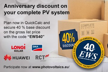 Since 1985, EWS has been a PV planning office, wholesaler, and trusted partner of the trade. Now we are proudly celebrating our 40th anniversary! Our success wouldn’t have been possible without you, our customers. That’s why we are saying THANK YOU all year long – with monthly anniversary promotions you can benefit from.