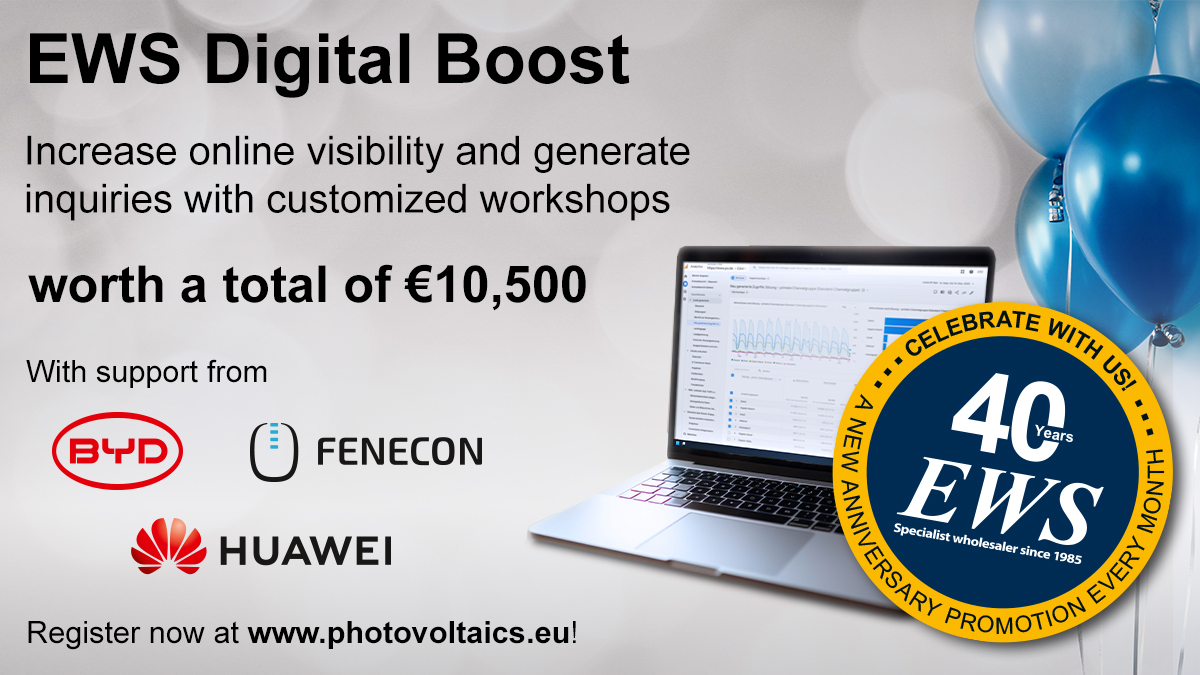 As part of the anniversary campaign launched in autumn to mark its 40th company anniversary, EWS will award seven digital marketing packages to interested customers in January 2026. In addition to recommendations from friends, family and neighbours, many end customers now find their solar installer online. A well-maintained website and expertise in online marketing therefore play a key role for solar professionals in continuously generating new enquiries. The initiative is supported by selected brand partners from the EWS portfolio.