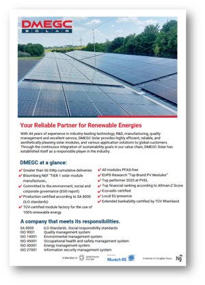 We have compiled the most important information and USPs on DMEGC and its products for you and your customers in the flyer “DMEGC Solar – At a glance”. For more details, please also check the B2C brochure. You are welcome to use both leaflets for your sales work.