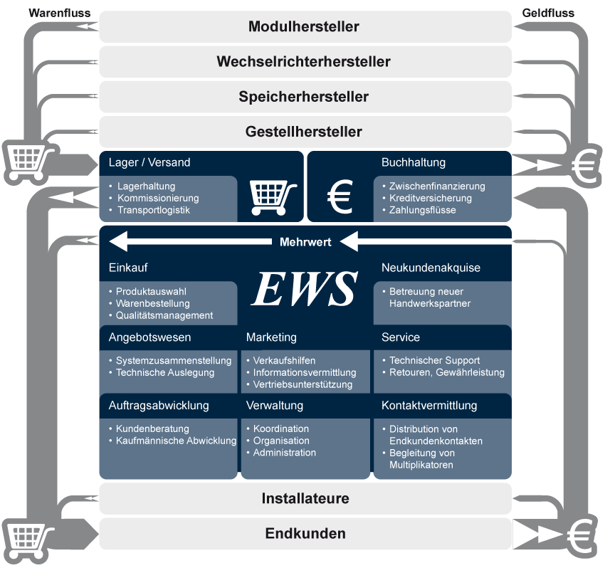 EWS fungiert auf allen Ebenen der Wertschöpfungskette als Bindeglied und unterstützt alle Beteiligten durch die Weiterentwicklung von effizienten Strukturen, Prozessen und Routinen.