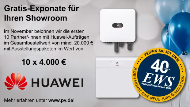 Zum Auftakt präsentiert EWS gemeinsam mit Huawei ein exklusives Angebot für Fachbetriebe. Sichern Sie sich eines von zehn Showroom-Paketen im Wert von je 4.000 € und machen Sie Ihre Kundenberatung zum Erlebnis!