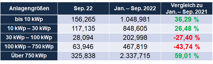 Der „große Satz nach oben“ ist insbesondere den Anlagen über 750 kWp Leistung zuzuschreiben: Hier wurde mit 325,838 MWp rund 47 % Prozent der Leistung im September realisiert – und somit rund 140 MWp mehr als noch im Vormonat. Alle anderen Segmente verharren auf dem Niveau der Vormonate. Der Anteil der Kleinanlagen bis 30 kWp an der zugebauten Leistung beträgt 40 %. Die genaue Aufteilung des Zubaus auf die einzelnen Segmente sowie ein Vergleich der Monate Januar bis September 2021 und 2022 sehen Sie in der Tabelle.