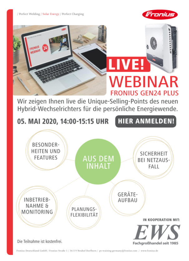 Besonderes Highlight ist eine Liveschaltung zu den Fronius Technikern, die Ihnen den Fronius GEN24 Plus vorstellen. Erleben Sie live, wie einfach und komfortabel die Montage erfolgt.