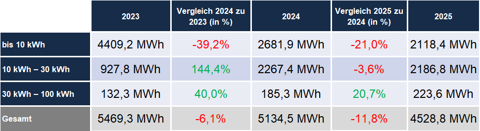 Entwicklung des Speicherzubaus nach Größenklassen: kleine Speicher rückläufig, Großspeicher im Wachstum