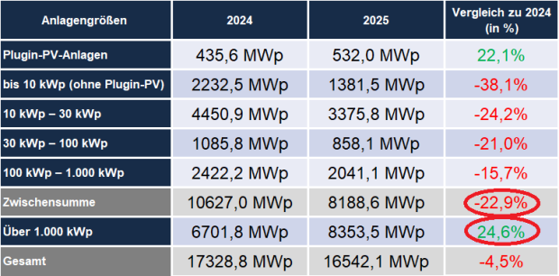 Mit einem Zubau von 1.202 kWp im Dezember bleibt der Jahreszubau unter dem Vorjahresniveau. Während große Anlagen die Statistik weiterhin stützen, verzeichnet das Segment bis 100 kWp einen deutlichen Rückgang. Im Vergleich zu den Vorjahren zeichnet sich damit eine zunehmend ausgeprägte strukturelle Verschiebung im Markt ab.