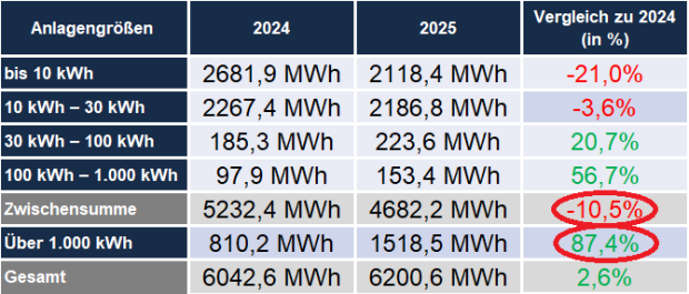 Entwicklung des Speicherzubaus nach Größenklassen: kleine Speicher rückläufig, Großspeicher im Wachstum