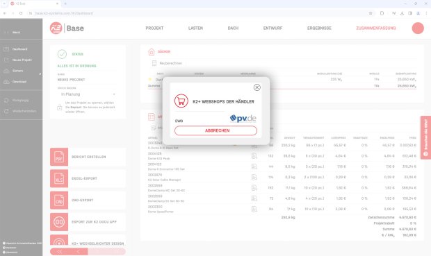 Der Bestellprozess von K2-Montagesystemen bei EWS wird zukünftig einfacher und schneller: Dank einer praktischen Schnittstelle im K2 Base-Planungstool können Sie als Solar-Profi ab sofort nach Abschluss der Montagesystem-Auslegung bei unserem Partner die benötigten Artikel direkt in Ihren QuickShop-Warenkorb legen.