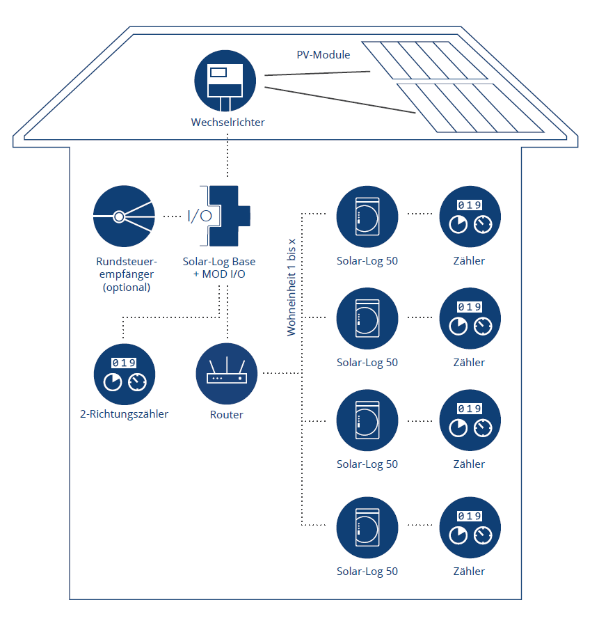 Bei der Solar-Log Lösung handelt es sich um ein kostengünstiges, modular erweiterbares System, das auf unbegrenzt viele Wohneinheiten skalierbar ist: Nach dem Aufbau der PV-Anlage mit Solar-Log™ Komponenten (z. B. dem Solar-Log Base) und Übertragung in das Portal Solar-Log WEB Enerest™ 4 erfolgt im zweiten Schritt der Aufbau der Visualisierung in den Wohneinheiten. Hierzu empfiehlt Solar-Log den Einsatz von Solar-Log 50 (ein Solar-Log 50 pro Wohneinheit). Die Installation der Hardware ist dank Plug & Play dabei besonders einfach und schnell. Im Anschluss werden die verwendeten Komponenten im Portal Solar-Log WEB Enerest™ 4 angelegt sowie die jeweiligen Mieter als Benutzer/User im Portal zugewiesen. Die Mieter erhalten abschließend eine E-Mail zur Passwortvergabe. Über die Enerest ToGo App können sie sich gratis die Erzeugung/Einspeisung sowie den eigenen Eigenverbrauch anzeigen lassen.