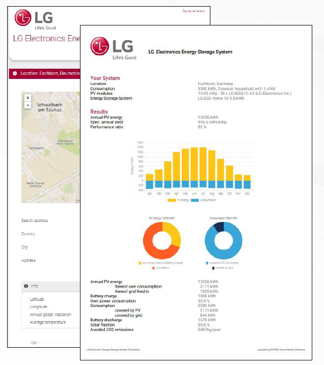 Zur einfachen Darstellung einer PV-Anlage mit einem LG ESS Home stellt LG Electronics Installateuren zusätzlich ein Online-Tool zur Verfügung, mit dem sich unterschiedliche Anlagenauslegungen simulieren lassen. Neben einer Stringkonfiguration und der Auswahl eines geeigneten Lastprofils können auch die Speichergrößen dimensioniert werden. Ein Projektausdruck der Ergebnisse kann dem Kunden schnell und komfortabel als PDF oder Ausdruck übermittelt werden.