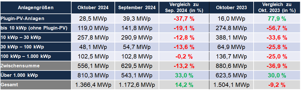 Diese Tendenz zeigt sich auch im aktuellen Monat: Rückläufig sind alle Anlagenklassen unter 1 MWp Leistung, und dies zum Teil deutlich. In einer Zwischensumme liegen diese Anlagen im Vergleich zum Vormonat um 13 % zurück und im Vergleich zum Oktober des Vorjahres um 37 %.