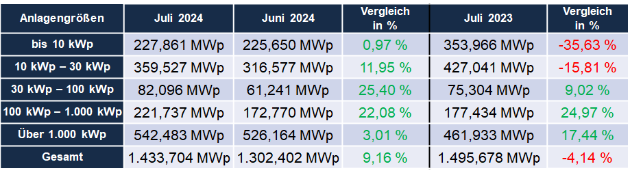 Die heute veröffentlichten Meldezahlen der Bundesnetzagentur zeigen für den Monat Juli 2024 einen leichten Anstieg des PV-Zubaus in Deutschland – und das über alle Anlagengrößen hinweg. Mit 1,4045 GWp liegt das Ergebnis für den Juli 2024 rund 100 MWp über dem Vormonat und leicht unter dem Niveau vom Juli 2023 (rund 60 MWp).