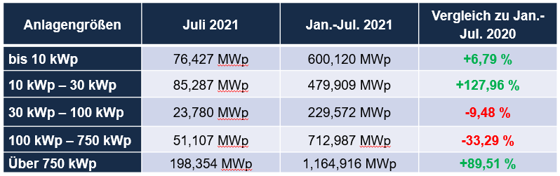 Mit einem neu registrierten Photovoltaik-Zubau von 434,956 MWp Anlagenleistung startet der Juli 2021 mit einer leichten Verbesserung gegenüber dem Vormonat in die zweite Hälfte des Jahres. Der Höhenflug aus dem diesjährigen April bleibt bisher unerreicht. Insgesamt verzeichnet 2021 bisher 3,187 GWp Brutto-Zubau.
