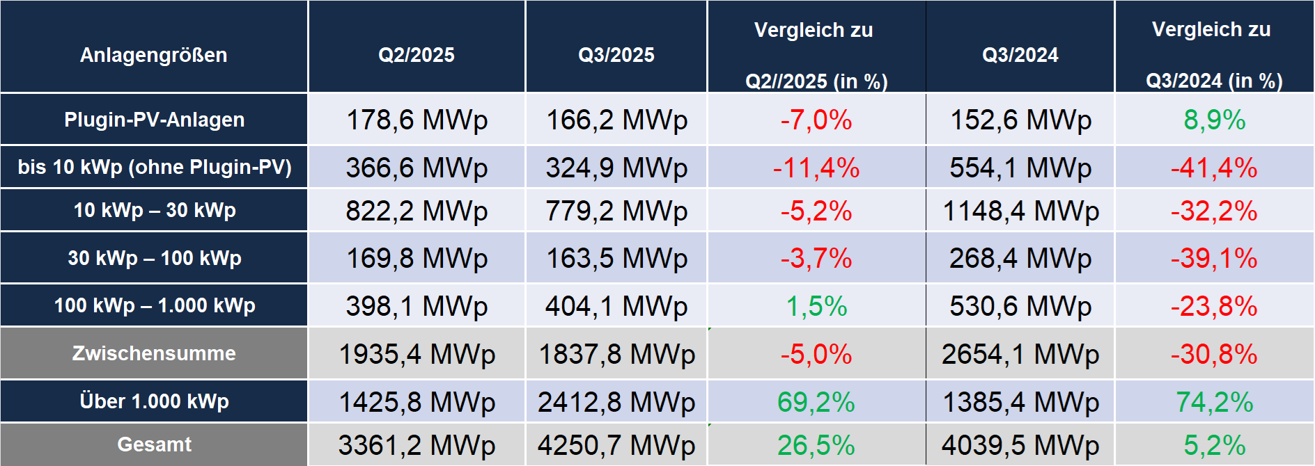 4,251 GWp wurden im dritten Quartal 2025 zugebaut – und somit fast genau die gleiche Leistung wie in den beiden Vorjahren. Hiermit enden jedoch die Gemeinsamkeiten, denn die Verteilung nach Anlagensegmenten verdeutlicht große Unterschiede. Machten in den vergangenen Jahren bisher Anlagen bis 1.000 kWp den Löwenanteil des Gesamtzubaus aus (2023: 73 %, 2024: 65 %), sind es nun die Großanlagen, die den Markt tragen: Gut 57 % der bei der Bundesnetzagentur registrierten Leistung entfällt auf Projekte über 1.000 kWp, Der Markt hat sich also komplett gedreht.