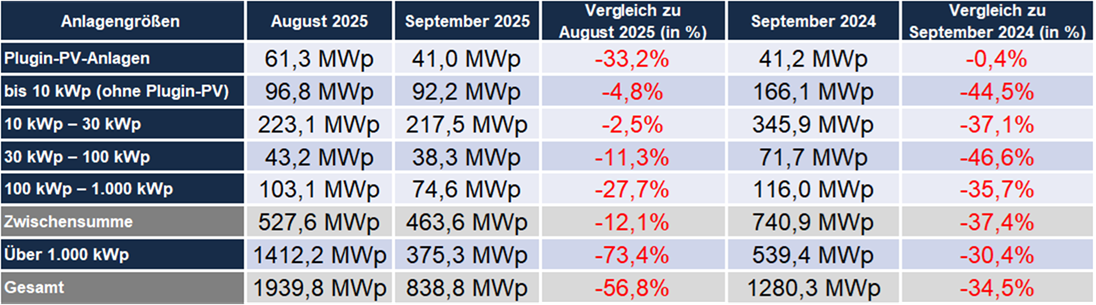Die von vielen erhoffte Belebung des Marktes nach der Sommerpause, insbesondere des Eigenheim- und Gewerbebereichs, ist im September 2025 leider ausgeblieben. Mit 836 MWp liegt das Gesamtergebnis aktuell (Stand: 13.10.2025) vor den üblichen Nachmeldungen auf dem niedrigsten Wert seit Dezember 2022. Dies entspricht knapp 56 % weniger als noch im August 2025 und ein Drittel weniger als vor einem Jahr.