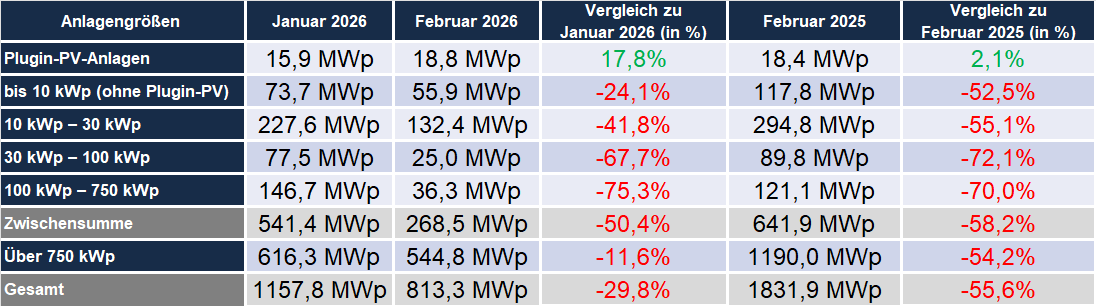 Der Februar zählt traditionell zu den schwächeren Installationsmonaten im Photovoltaikmarkt. Auch im Februar 2026 zeigt sich dieser saisonale Effekt: Mit 813 MWp neu installierter Leistung wurden die niedrigsten Monatswerte seit Dezember 2022 erreicht – eine Entwicklung, die sich auch im Aufdachsegment widerspiegelt.