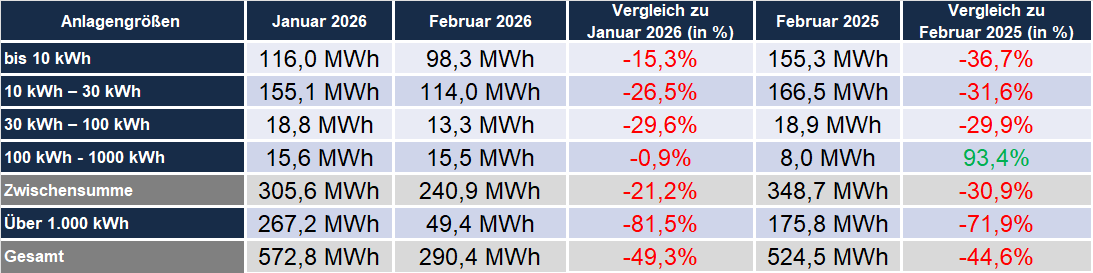 Installierte Speicherkapazität nach Größenklassen (Februar 2025 – 2026)