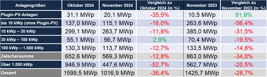 Die Zubauzahlen für 2024 bleiben weiter unter dem von der Politik vorgegebenen Zielkorridor. Bis gestern wurden im November 1.013,5 MWp an neu registrierter Netto-Leistung bei der Bundesnetzagentur gemeldet – ein Rückgang von rund 400 MWp gegenüber dem Vorjahreszeitraum.