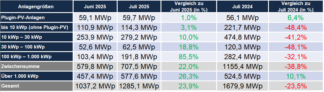 Die PV-Zubauzahlen für Juli 2025 scheinen erstmals seit Monaten auf eine leichte Belebung hinzudeuten. Dennoch bleibt das Gesamtvolumen deutlich hinter den Vergleichswerten der Vorjahre zurück. Besonders das Segment der kleineren Dachanlagen bewegt sich weiterhin auf einem niedrigen Niveau. Neue Impulse für den Markt werden frühestens im Herbst erwartet – nach dem für die Solarbranche üblichen Sommerloch. Positive Zeichen kommen aus dem Bereich Elektromobilität und Wärmepumpe.