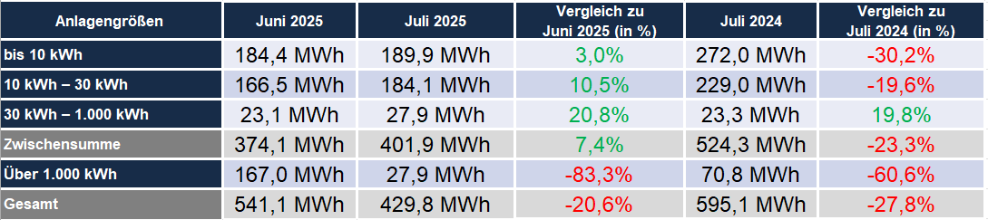 Unter Einbeziehung noch zu erwartender Nachmeldungen zeigt sich für Juli mit 1.285,1 MWp (Stand: 13.08.2025) eine leicht ansteigende Tendenz beim Zubau. Im Vergleich zum Vormonat liegt das Wachstum in allen Anlagensegmenten erfreulicherweise leicht im Plus, doch gegenüber dem Vorjahr ist die Entwicklung weiterhin deutlich schwächer. Besonders Freiflächenanlagen tragen mit den größten Zuwächsen zum Gesamtbild bei, während der Zubau im gewerblichen Dachanlagenbereich eher verhalten bleibt.