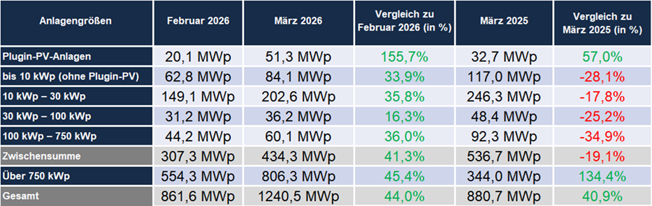 Beim PV-Zubau geht es wieder aufwärts – wenn auch nicht auf dem Level, der laut gesetzlich vorgegebenem Zubaupfad erforderlich wäre: Gut 44 % liegt der März 2026 über dem Vormonat und 40 % über dem Vorjahreszeitraum. Diese fielen mit einem jeweiligen Zubau von unter 900 MWp ausgesprochen schwach aus, was den Zuwachs statistisch begünstigt. Erneut entscheidend zum März-Ergebnis beigetragen hat das Anlagensegment über 750 kWp, während die kleineren Anlagen zumindest im Vergleich zum Vorjahr nochmals verloren haben, ausgenommen die Steckersolar-Anlagen.