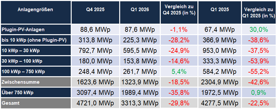 Nach dem ersten Quartal 2026 liegt der PV-Zubau bisher bei einer neu registrierten Leistung von 3,3 GWp. Dies ist 22,5 % weniger als noch 2024 bzw. 2025 – und entspricht ungefähr dem Niveau, das 2023 erreicht wurde.