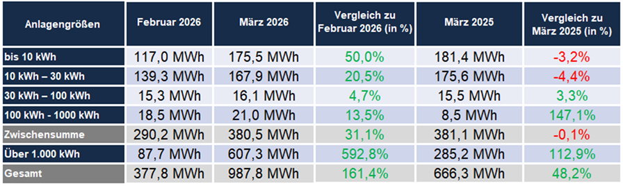 Solche Projekte sind wichtig für das Stromnetz, gehen jedoch weitgehend am klassischen Handwerk vorbei, das insbesondere das Heim- und Gewerbespeichersegment bedient. Diese Anlagentypen haben sich im März nach einem schwachen Jahresstart im Vergleich zu den Vormonaten aber ebenfalls leicht erholt.