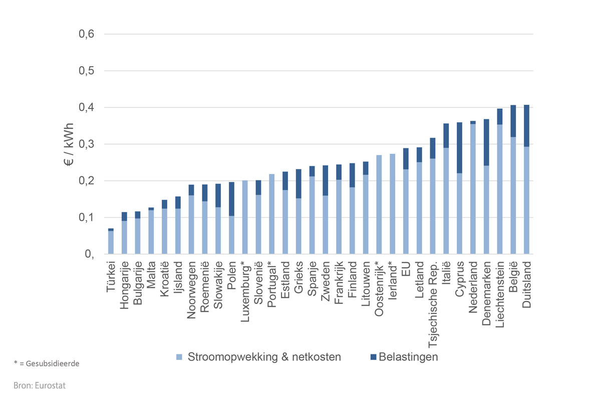 Elpriset per kWh för privata hushåll bestäms till stor del av skatter och avgifter. Priserna anges för ett hushåll med en elförbrukning på 2.500 - 5.000 kWh/år.