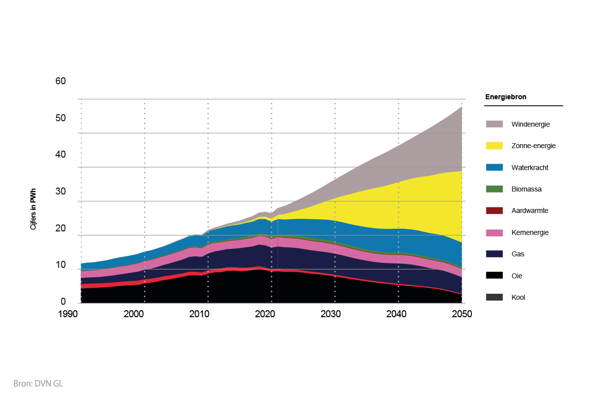 De grafiek laat zien dat hernieuwbare energiebronnen in de toekomst de wereldwijde elektriciteitsproductie zullen domineren. Tegen 2050 zal het aandeel van fotovoltaïsche energie naar verwachting stijgen tot ongeveer 35 procent van de totale opwekking.