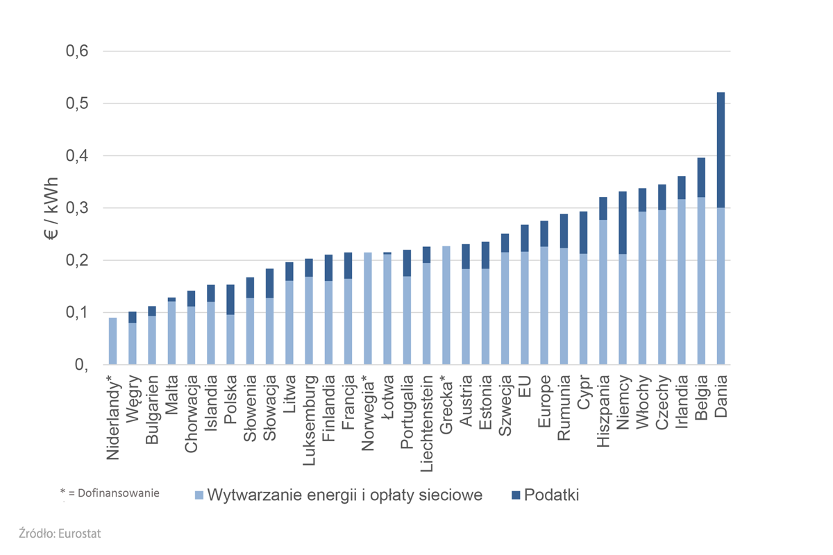 Ceny energii elektrycznej dla prywatnych gospodarstw domowych w Europie (zużycie energii elektrycznej: 2500 - 5000 kWh/rok) wahały się od 9 do 52 centów/kWh w 2022 roku.