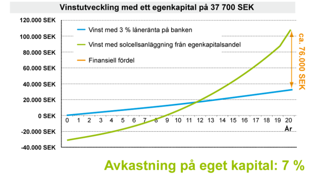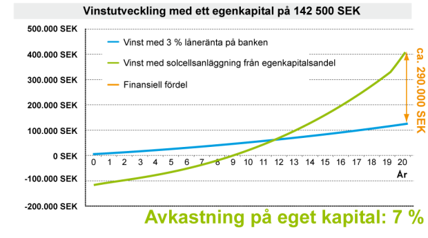 Lagstadgade grundvillkor, mogen teknik så väl som en erfaren installatör säkrar förutsägbarheten för den ekonomiska prognosen. Följande beräkning visar hur självförbrukning kan leda till en avkastning på eget kapital om 7 %.