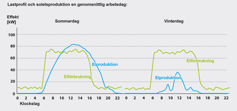 Elförbrukning, lastprofil (ert tidsvarierande elbehov) och storleken på er solcellsanläggning bör vara väl anpassade gentemot varandra. Till exempel har en matvarubutik, med kylanläggningar som är igång även under helger, en annan lastprofil än en kontorslokal som har öppet enbart under vardagar.