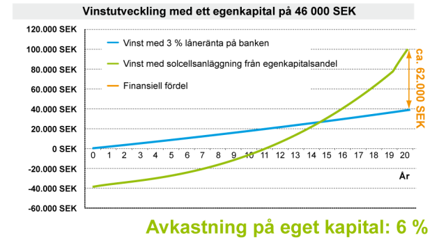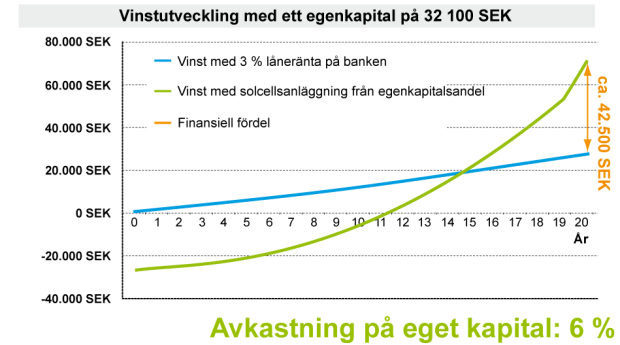 Tack vare lågräntelån för finansiering är investeringen i en solcellsanläggning också med liten egenkapitalsandel mycket attraktiv. Kontakta din bank för vidare information.