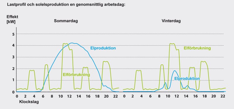 Elförbrukning, lastprofil (ert tidsvarierande elbehov) och storleken på er solcellsanläggning bör vara väl anpassade gentemot varandra. Rekommendationen är därför att använda elförbrukare som tvättmaskinen, torktumlaren eller diskmaskinen på dagen då solen skiner. Ett annat alternativ är att lagra solelen till de mer energiintensiva kvällstimmarna.