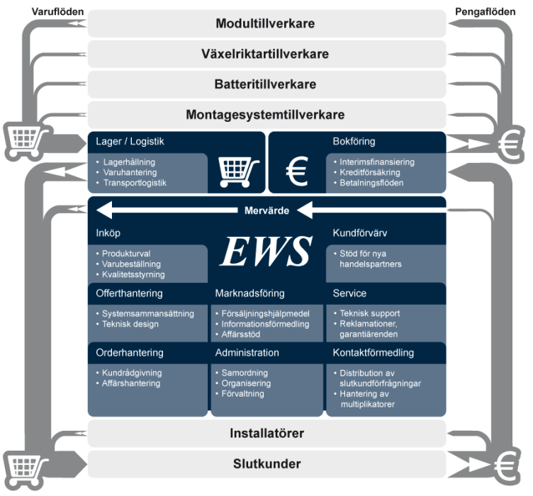 EWS fungerar som en länk mellan alla parter i värdekedjan och stödjer alla inblandade genom att vidareutveckla effektiva strukturer, processer och rutiner. I alla avdelningar, från rådgivning, projektplanering och lagerlogistik till organisering och interimsfinansiering av betalningsflöden så strävar alla EWS medarbetare mot att förbättra våra tjänster. Detta kräver en nära och smidig samordning mellan både enskilda interna avdelningar och med leverantörer och kunder.