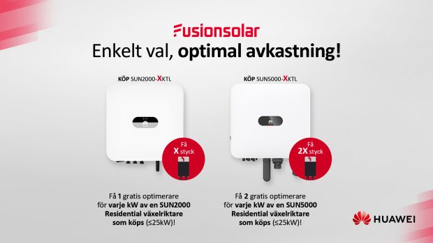 Vid köp av en Huawei FusionSolar växelriktare på upp till 25 kW får du också en SUN2000-optimerare per kilowatt växelriktareffekt gratis under kampanjperioden till och med den 13 december 2024.