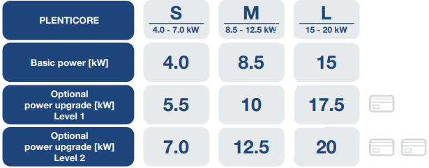 I det högre segmentet finns fyra nya effektklasser: 12,5 kW, 15 kW, 17,5 kW och 20 kW. Totalt kan följande effektnivåer uppnås med grundutrustningen och användning av en eller två PLENTICOIN: