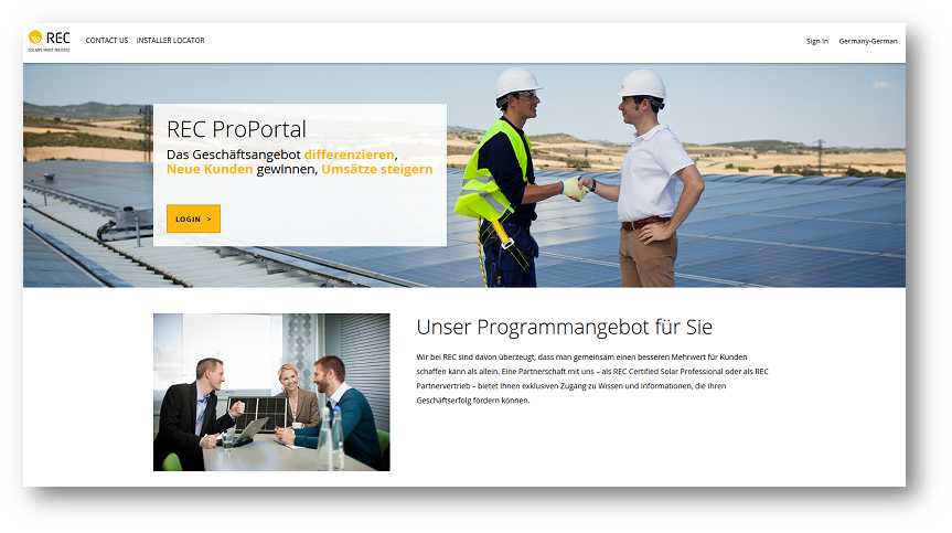 REC har startat en ny plattform för sina Solar Profesioan Partners, REC ProPortal. Under www.recgroup.com/proportal har certifierade REC-installatörer därigenom från och med nu en central kontaktplattform för sitt samarbete med solcellstillverkaren – med tillgång till all information, produktfördelar och onlineverktyg.
