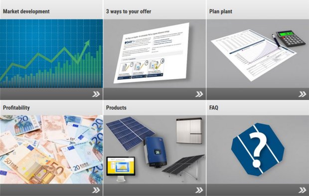 In order for you to you make a competent impression from the get-go, we offer you a complete information package for the integration on your website – with us providing regular updates of the content. With our website configurator QuickContent, you can choose from many content and design options and quickly and easily put together a solar content package in an individual design.