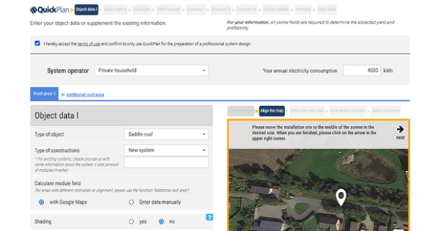 Your costumers can choose from 3 options how to get an offer: They can simply enter their contact details, have a rough project outline or, with just a few clicks, come up with an approximate evaluation of the prospects of success for the planned solar power system.