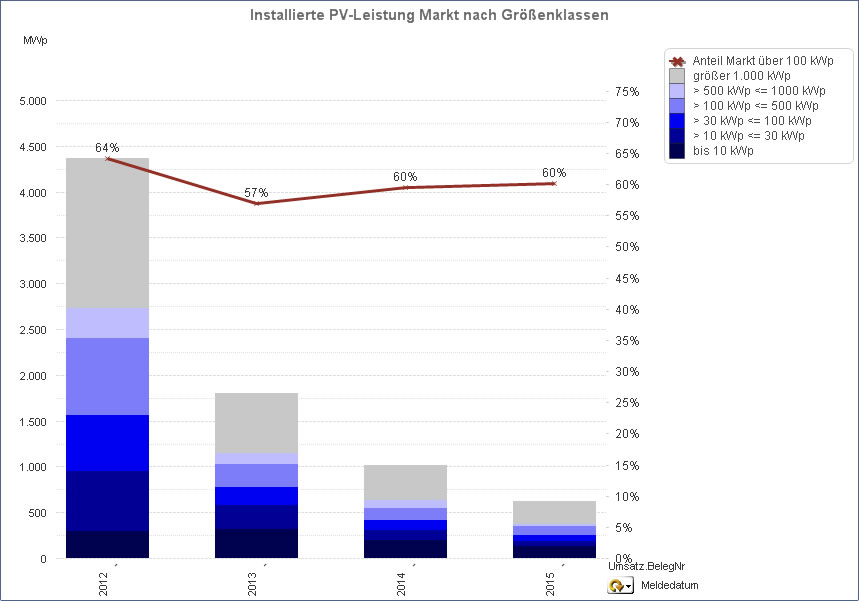 Mit dem gemeldeten Zubau von 95,502 MWp im Juni lagen die ersten sechs Monate 2015 damit bei nur ca. 60 % vom Zubau im Vergleichszeitraum des Vorjahres und nur bei ca. 14 % gegenüber 2012.