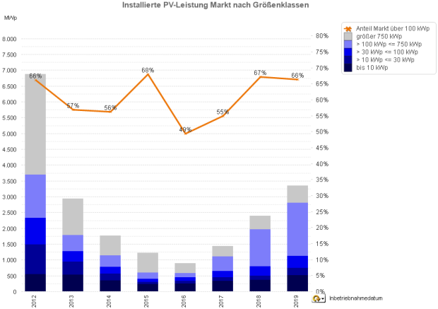 Bis Ende Oktober wurde damit in Deutschland in 2019 ca. 3.344 MWp neue PV-Leistung bei der Bundesnetzagentur gemeldet. Gegenüber dem Vergleichszeitraum des Vorjahres (2.393 MWp) ist dies ein Plus von 39,7 %.