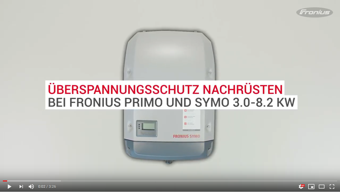 Für die Wechselrichter Fronius Symo 3.0-8.2, Fronius Symo Hybrid und Fronius Primo bietet unser Partner einen Überspannungsschutz Typ 1+2 als Nachrüstsatz an. Dieser ist für alle genannten Geräte gleichermaßen anwendbar – unabhängig davon, ob ein oder zwei Tracker verwendet werden. Die Installation des Nachrüstsets erfolgt im Anschlussbereich des Wechselrichters. Im Falle eines Auslösens des Überspannungsschutzes erhält der Anlagenbetreiber eine automatische Meldung über das Online Portal Fronius Solar.web (Voraussetzung ist ein Benutzerkonto). Wie die Umrüstung technisch umgesetzt wird, zeigt das Video der Einbauanleitung. Weitere Details entnehmen Sie ebenfalls dem Produktdatenblatt.